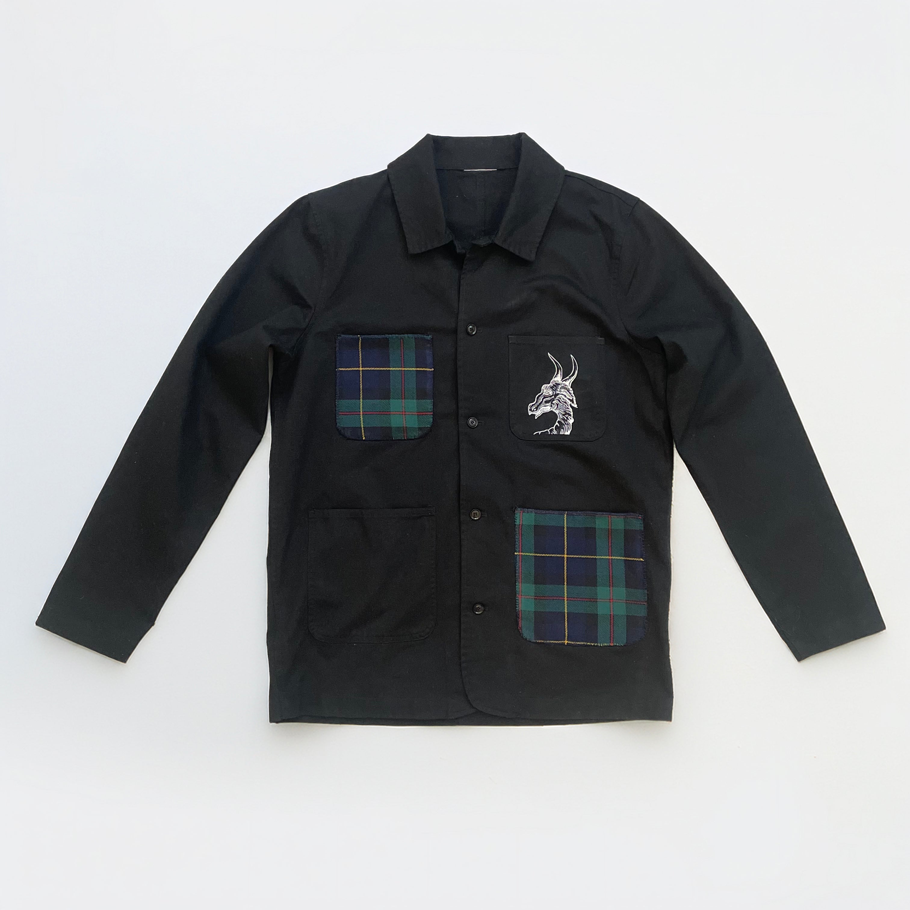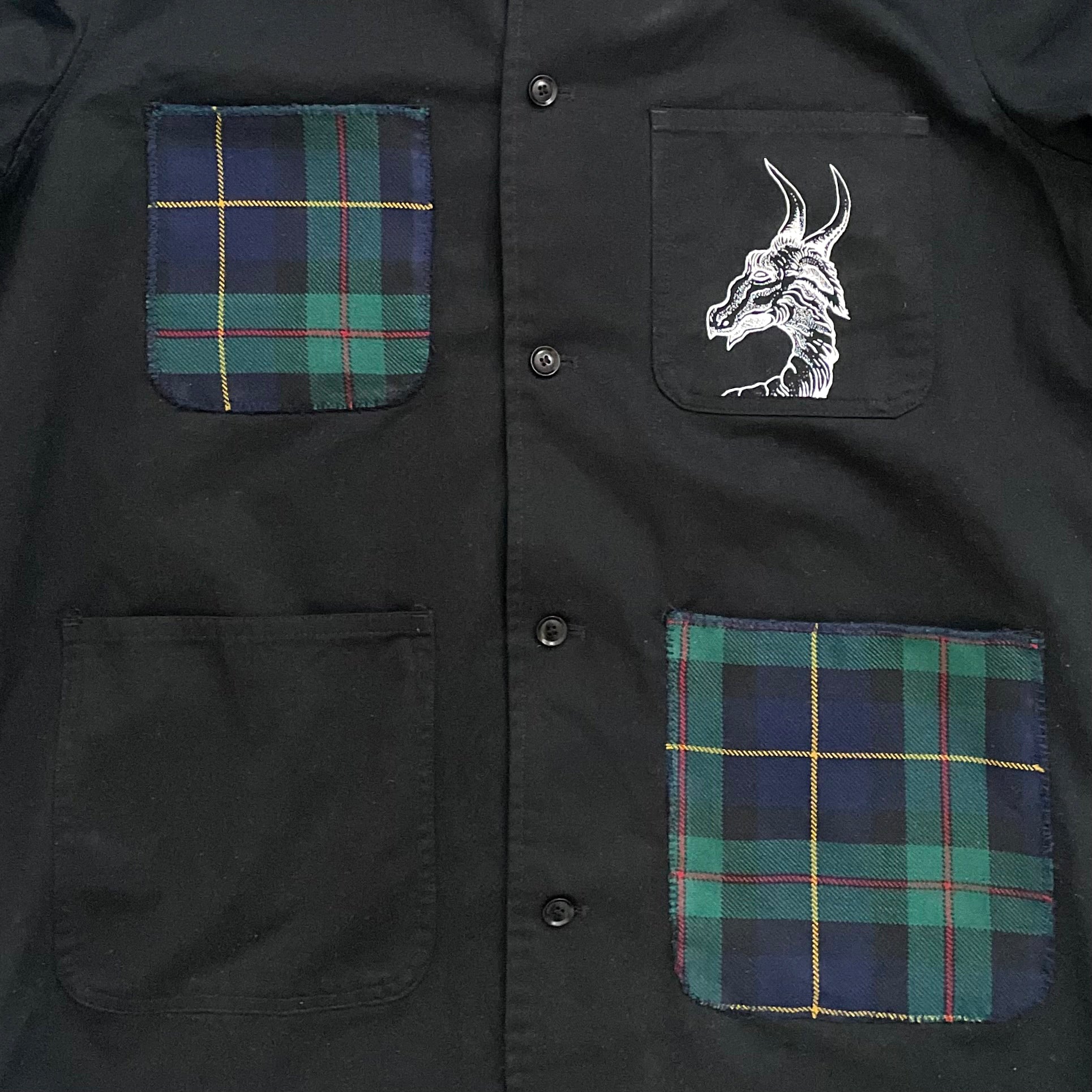 Custom printed & hand sewn wool plaid over pockets on work jacket