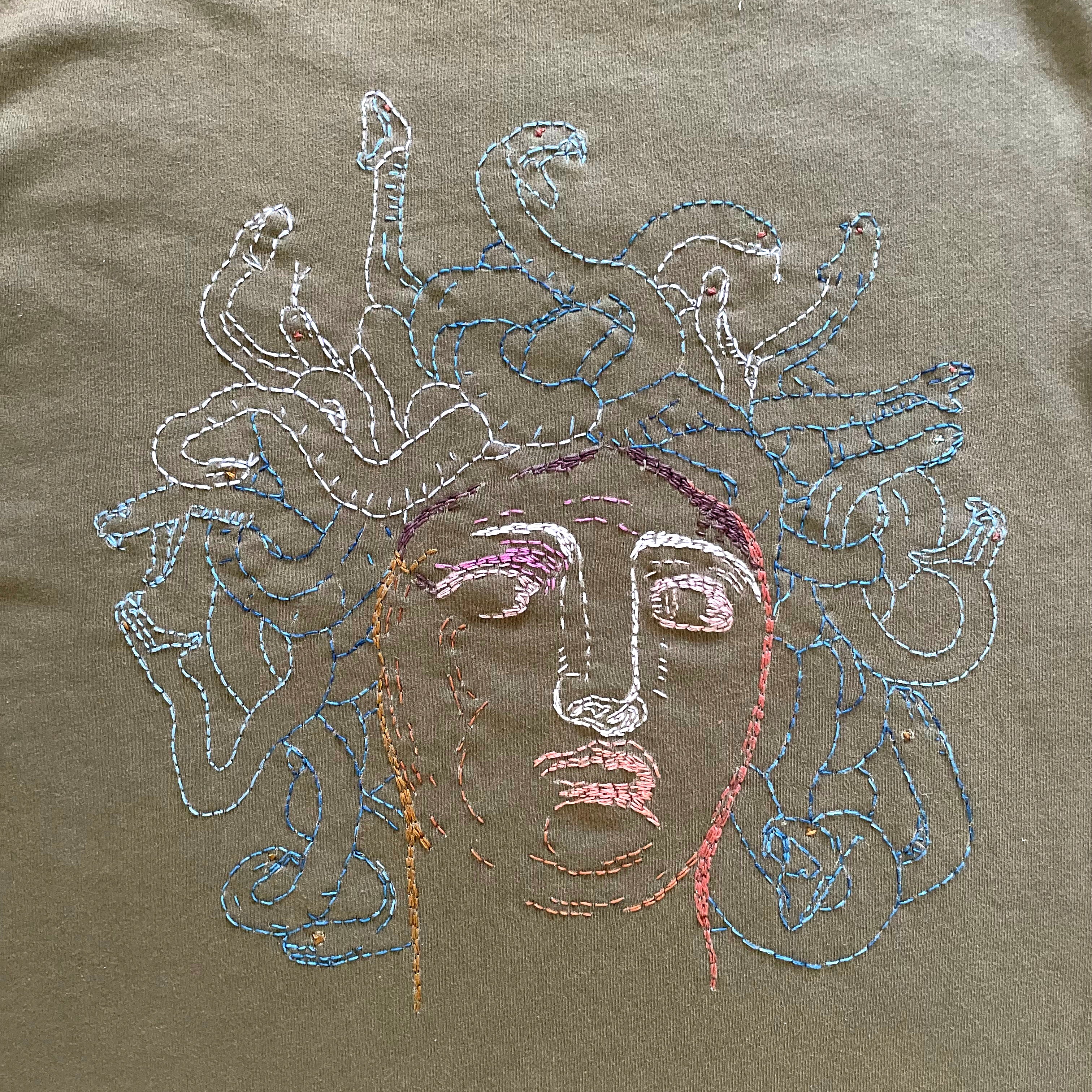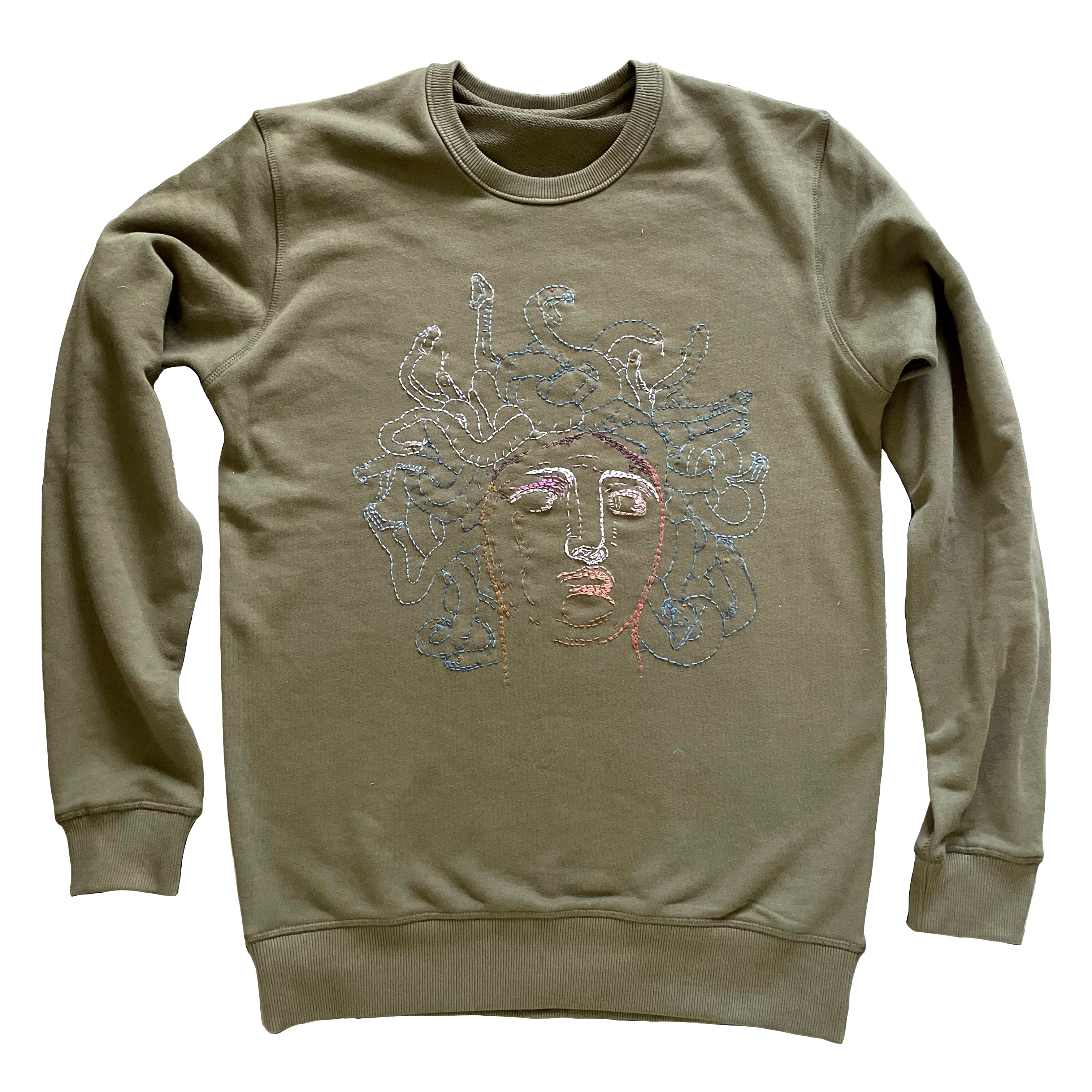 From a limited edition Medusa series - hand embroidered art on French Terry relaxed fit sweatshirt.