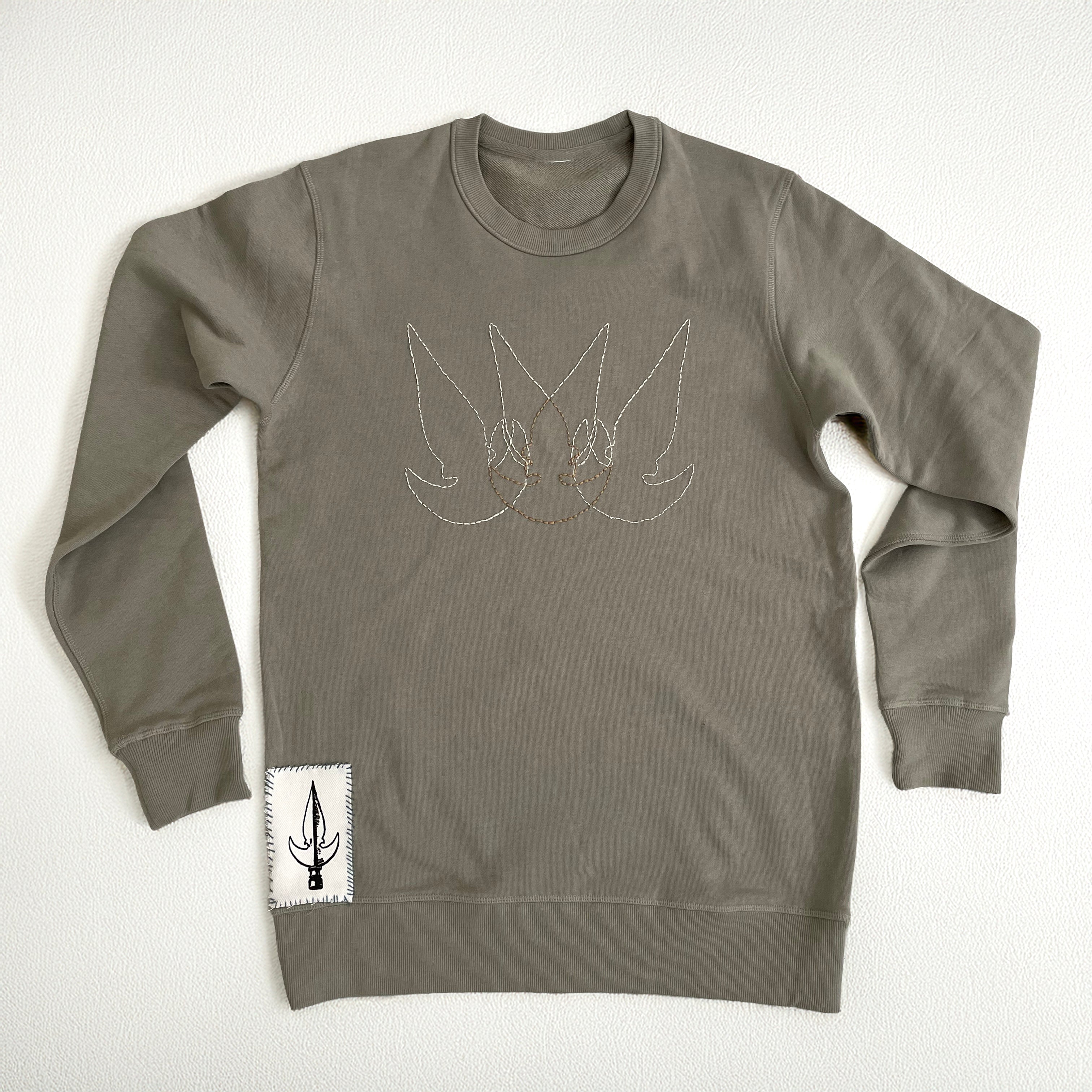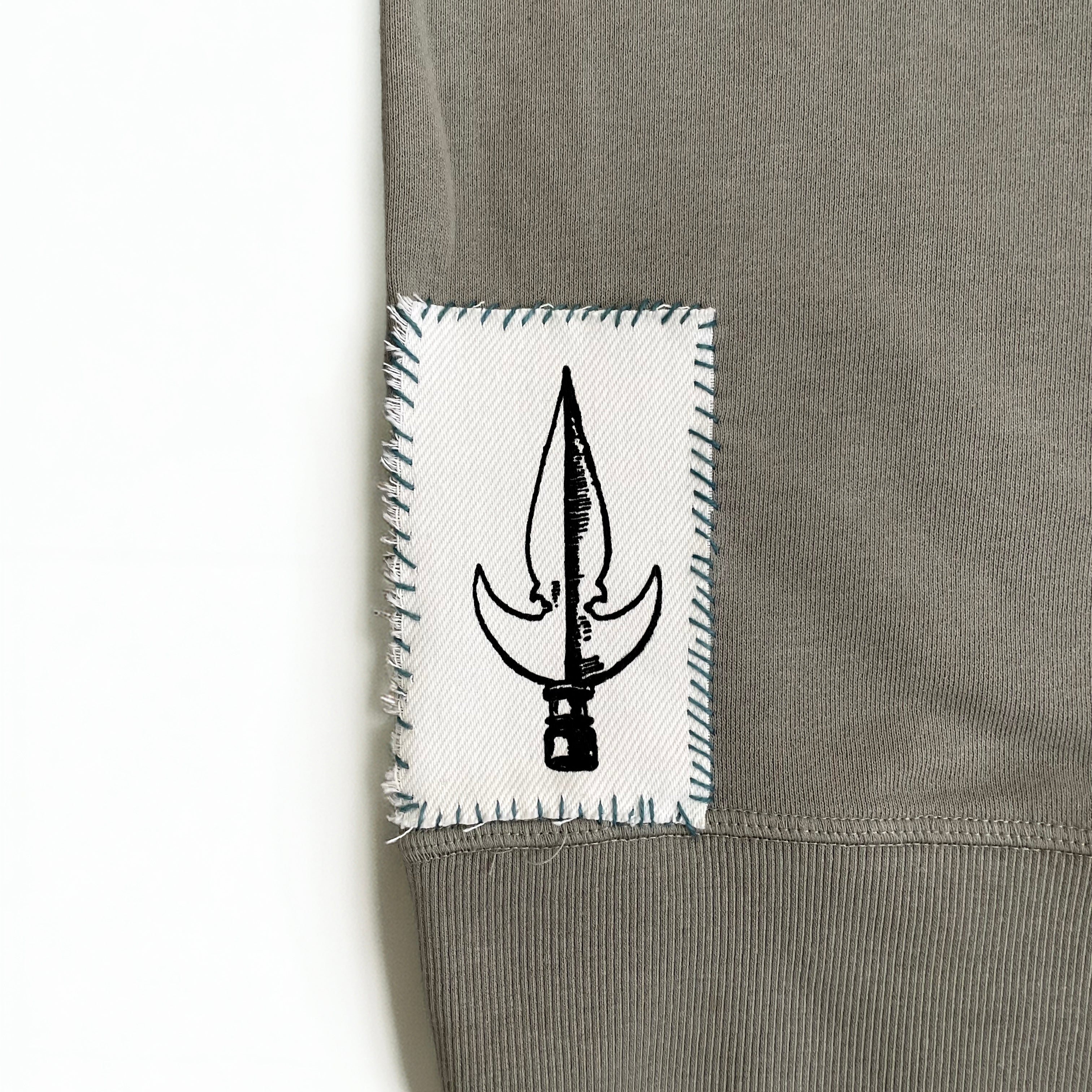 One of a kind hand embroidered and hand sewn patch print of classic Spear art on French Terry relaxed fit sweatshirt.